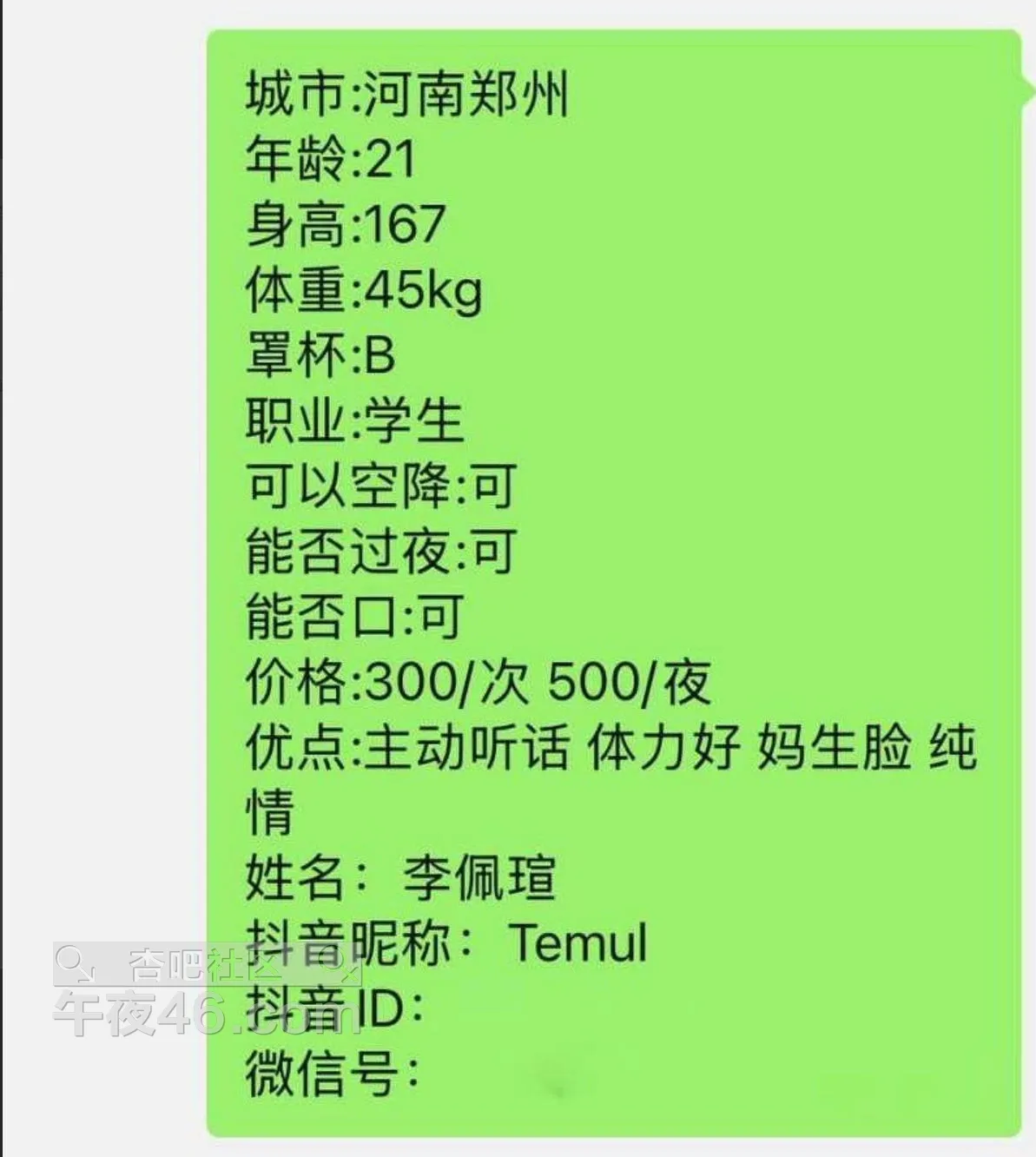 河南妓女 李佩瑄 五百包夜 因服务态度差得罪金主 自慰视频与个人信息全被曝出!【爆料请看简介】